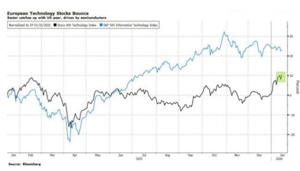 今年以来,欧洲科技股意外大幅跑赢美国同类板块。斯托克600科技指数单月上涨10%,成为该地区表现第二强的板块;而同期标普500信息技术指数则几乎持平。