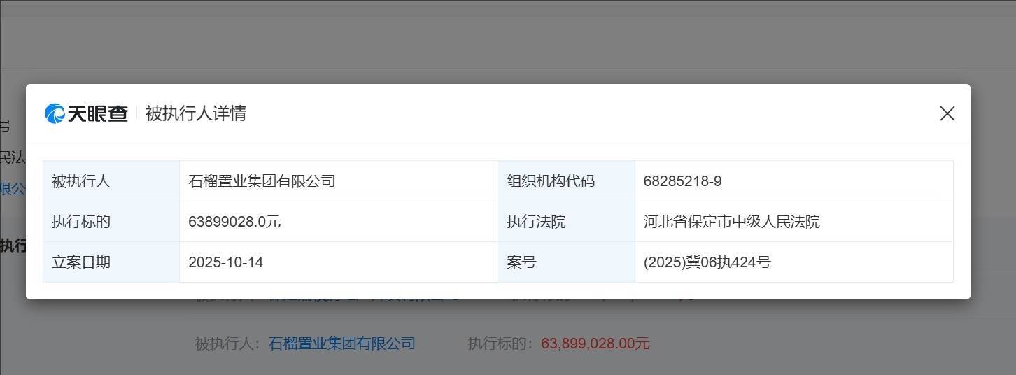 天眼查信息显示,10月14日,石榴置业已成为被执行人,执行标的为6300余万元。而其全资子公司石榴物业服务集团的官方公众号已于2024年12月停止更新。